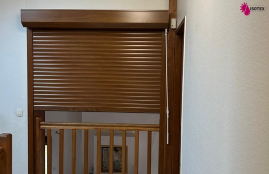 Volet roulant manuel sur mesure à L'Isle d'Abeau (38). Fabrication française (Nord Isère) : Alu isolant Chêne Doré à treuil. Qualité Isotex, garantie 7 ans.